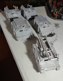 For Apocalypticon, I need a few Rhinos to make the deploying of my infantry quicker and easier - I'm taking quite a bit of it! The easy solution is deploy in transports, and of course I like to tinker and make them more Iron Warriorish. Therefore here are a mix of straight builds, digital kitbashes and conversion in progress pics of some Rhinos I found on Cults 3d. I have quite a few more underway, so pics as they come. Rules wise, these are just straight up Rhinos.